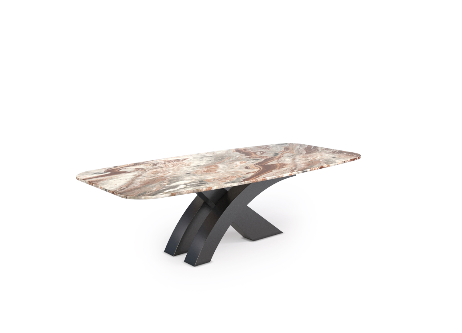 The luxurious "Saddle" table by Marb Steel symbolizes luxury and prominent elegance in furniture. It adds a touch of luxury and brings an exceptional style to the decor of any space. This table is the ideal choice for social gatherings and dining. It features a natural Italian marble surface, measures 260 cm in length, and is 120 cm in width, providing a spacious and comfortable area for use.