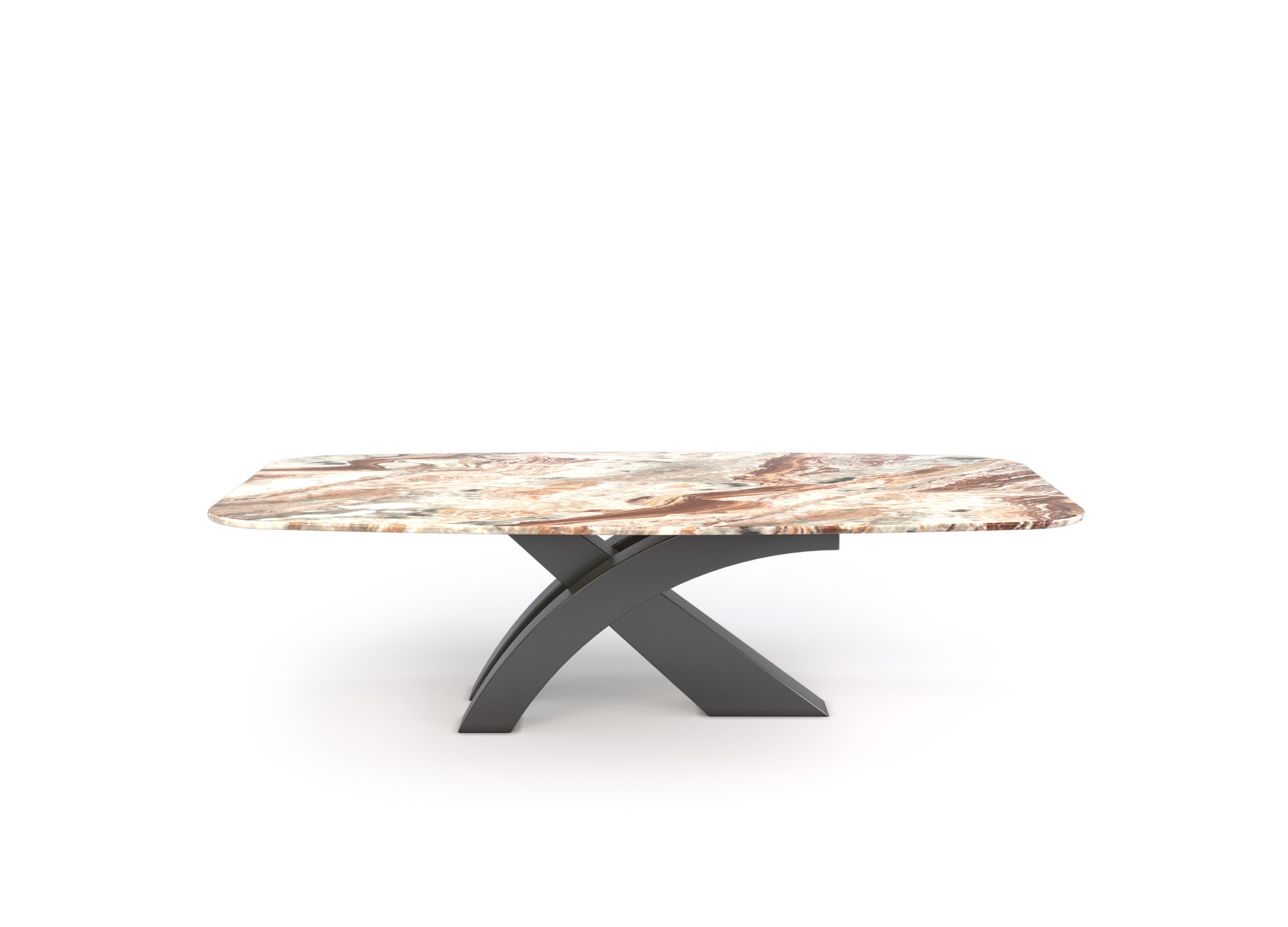 The luxurious "Saddle" table by Marb Steel symbolizes luxury and prominent elegance in furniture. It adds a touch of luxury and brings an exceptional style to the decor of any space. This table is the ideal choice for social gatherings and dining. It features a natural Italian marble surface, measures 260 cm in length, and is 120 cm in width, providing a spacious and comfortable area for use.